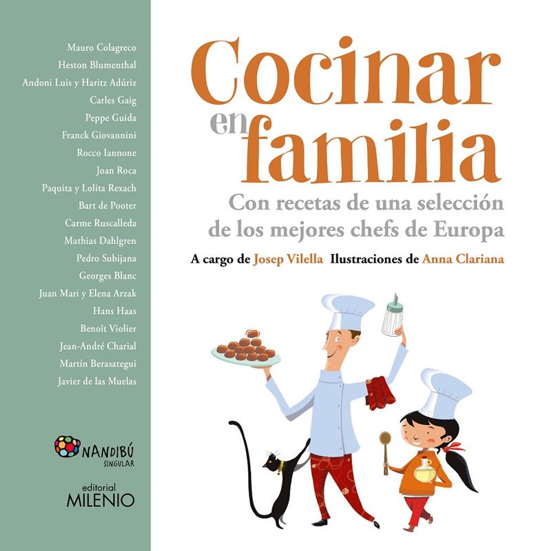 Cocinar en familia es un libro que pretende animaros a compartir con vuestros hijos un rato divertido y relajado ante los fogones. Algunos de los mejores chefs de Europa quieren ayudaros. Cada uno de ellos ha adaptado uno de sus platos “estrella” con esmero, manteniendo todo el espíritu de la receta original. En cada receta explican, paso a paso, todo el proceso y distinguen muy gráficamente las tareas que realizan los mayores de las que tienen que llevar a cabo los niños para conseguir un resultado que haga las delicias de los comensales.