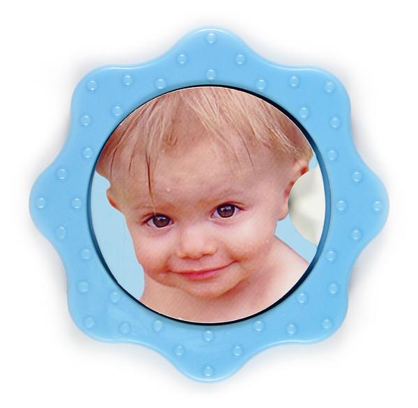 Un mordedor unido por un velcro a un libro de cartón extraíble con fotografías a todo color de objetos familiares al niño que son de color azul.