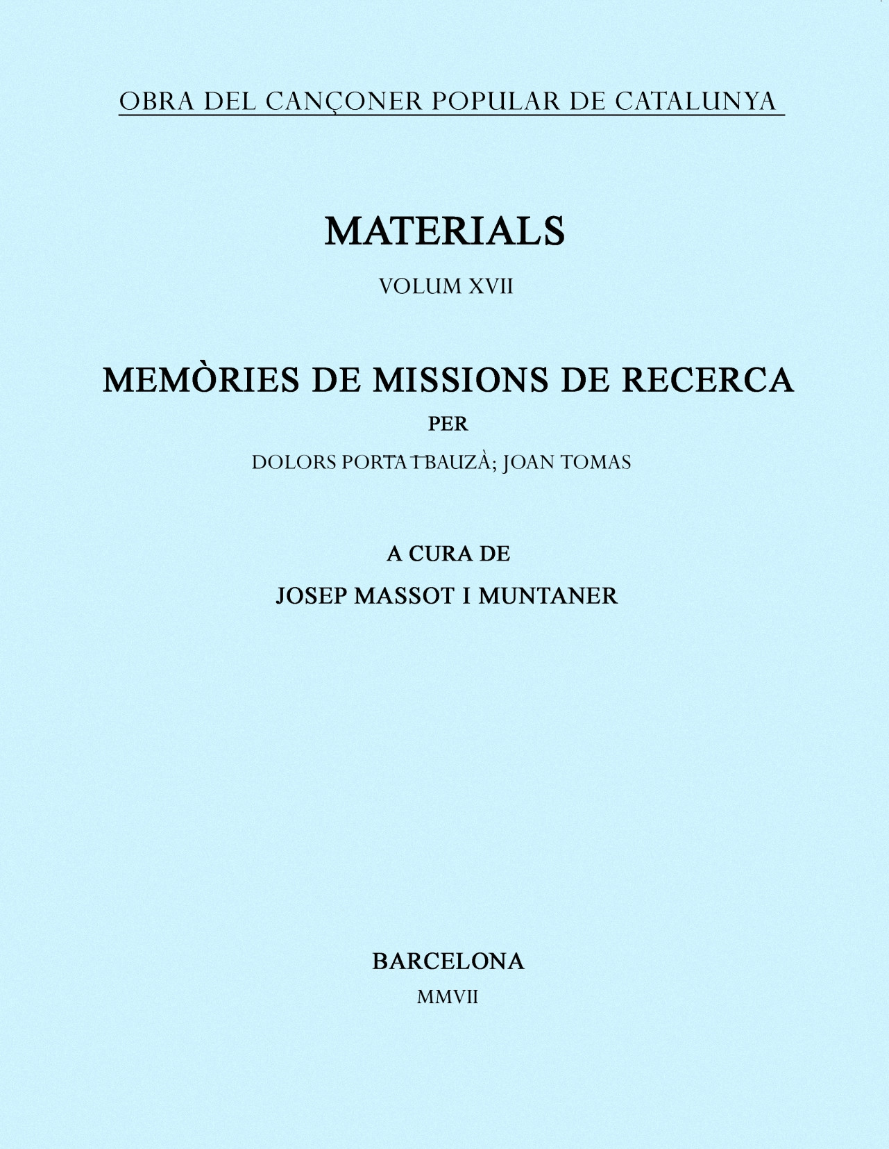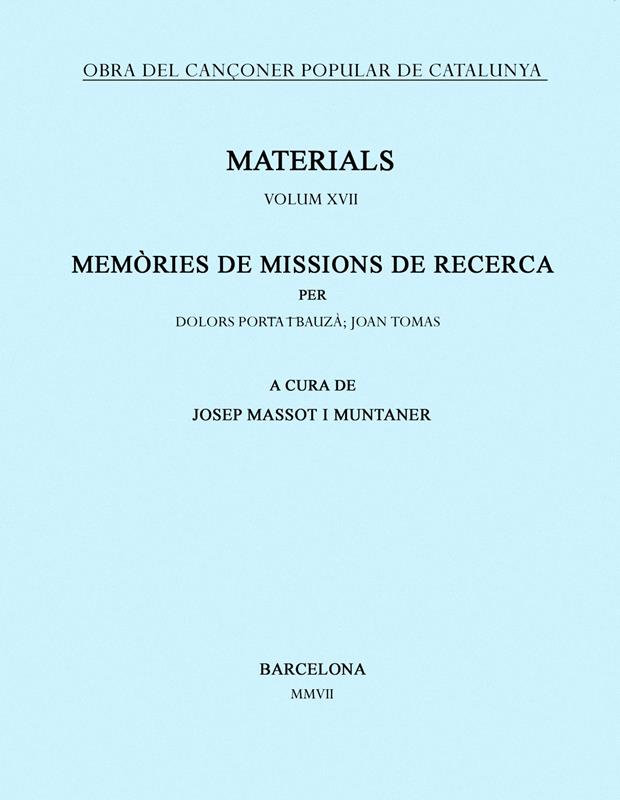 Edició de les memòries corresponents a les missions de recollida de cançons populars de Dolors Porta, als voltants de Palma de Mallorca, els estius de 1934 i de 1935; i de Joan Tomàs i Joan Llongueres i Galí, per la vall de Ribes, la Cerdanya i el Beridà, l?estiu de 1935, les darreres que va dur a terme l?Obra del Cançoner abans del col·lapse de la guerra civil.
