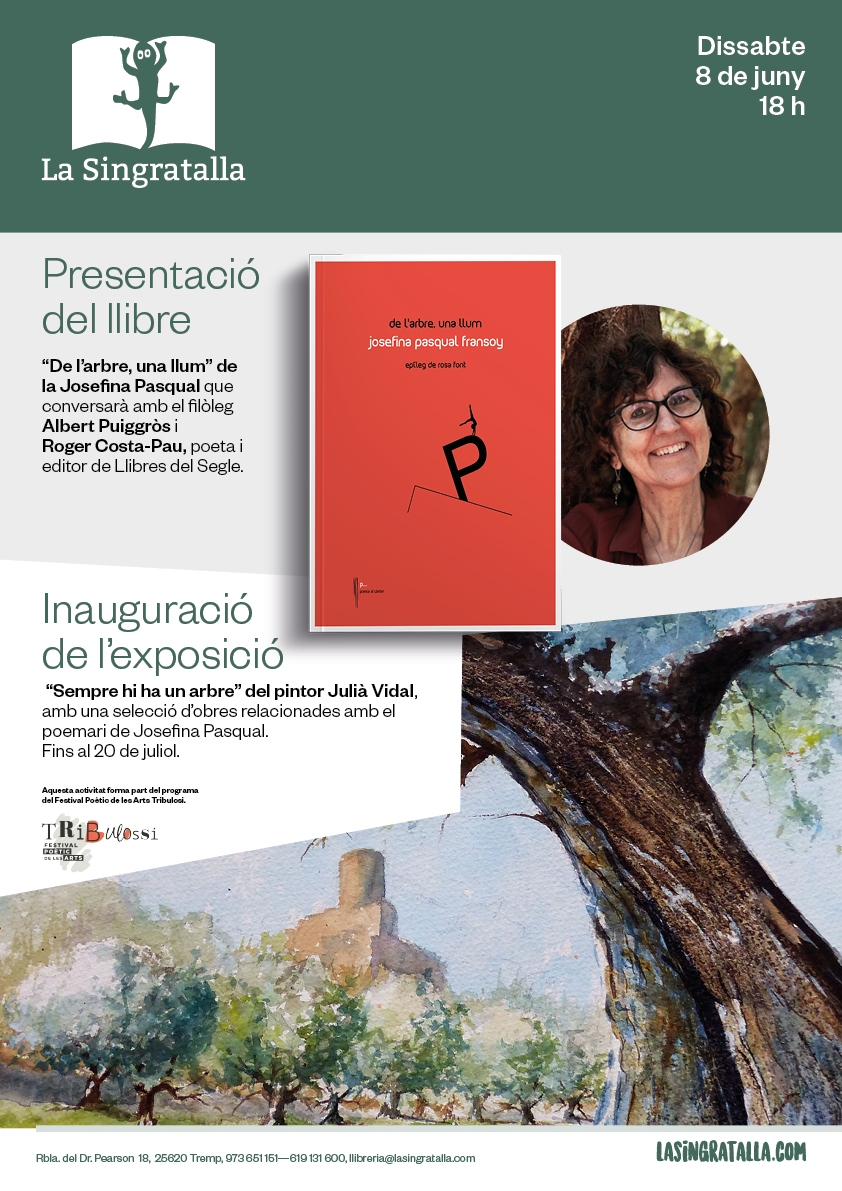 Presentació del llibre "De l'arbre, una llum", de JOSEFINA PASQUAL. Intervindran el filòleg Albert Puiggròs i el poeta i editor de Llibres del Segle, Roger Costa-Pau. Al mateix acte inaugurarem l'exposició de pintura "Sempre hi ha un arbre" de Julià Vidal.