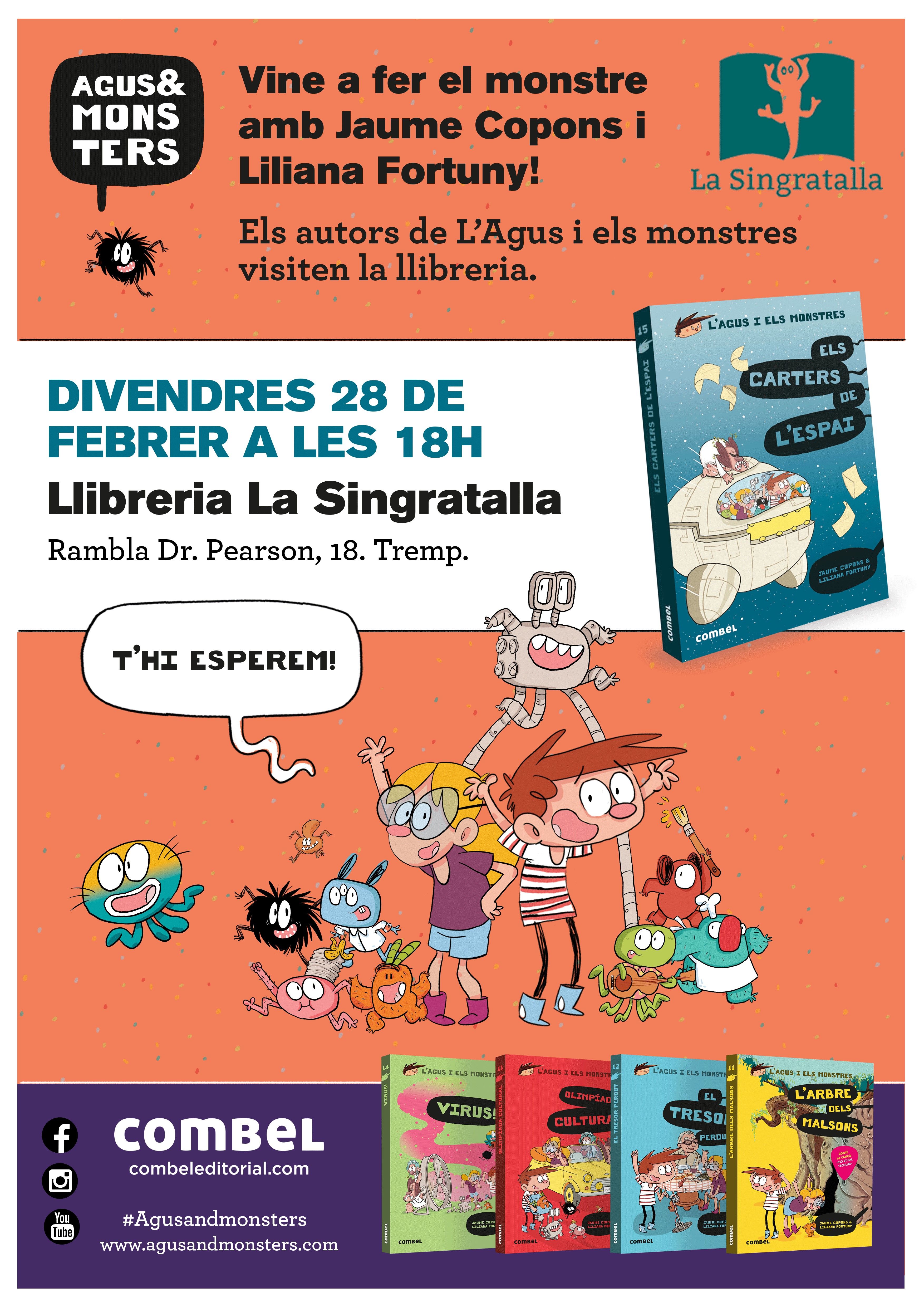 En Jaume i la Liliana ens convidaran a crear la familia més monstruosa de La Singratalla! L’escriptor i la il·lustradora ens explicaran com va néixer L’Agus i els monstres, el seu procés creatiu i com treballen fins que un nou títol de la col·lecció surt publicat. Durant l’activitat, en Jaume Copons ens ajudarà a imaginar monstres mentre la Liliana Fortuny els va dibuixant en directe.