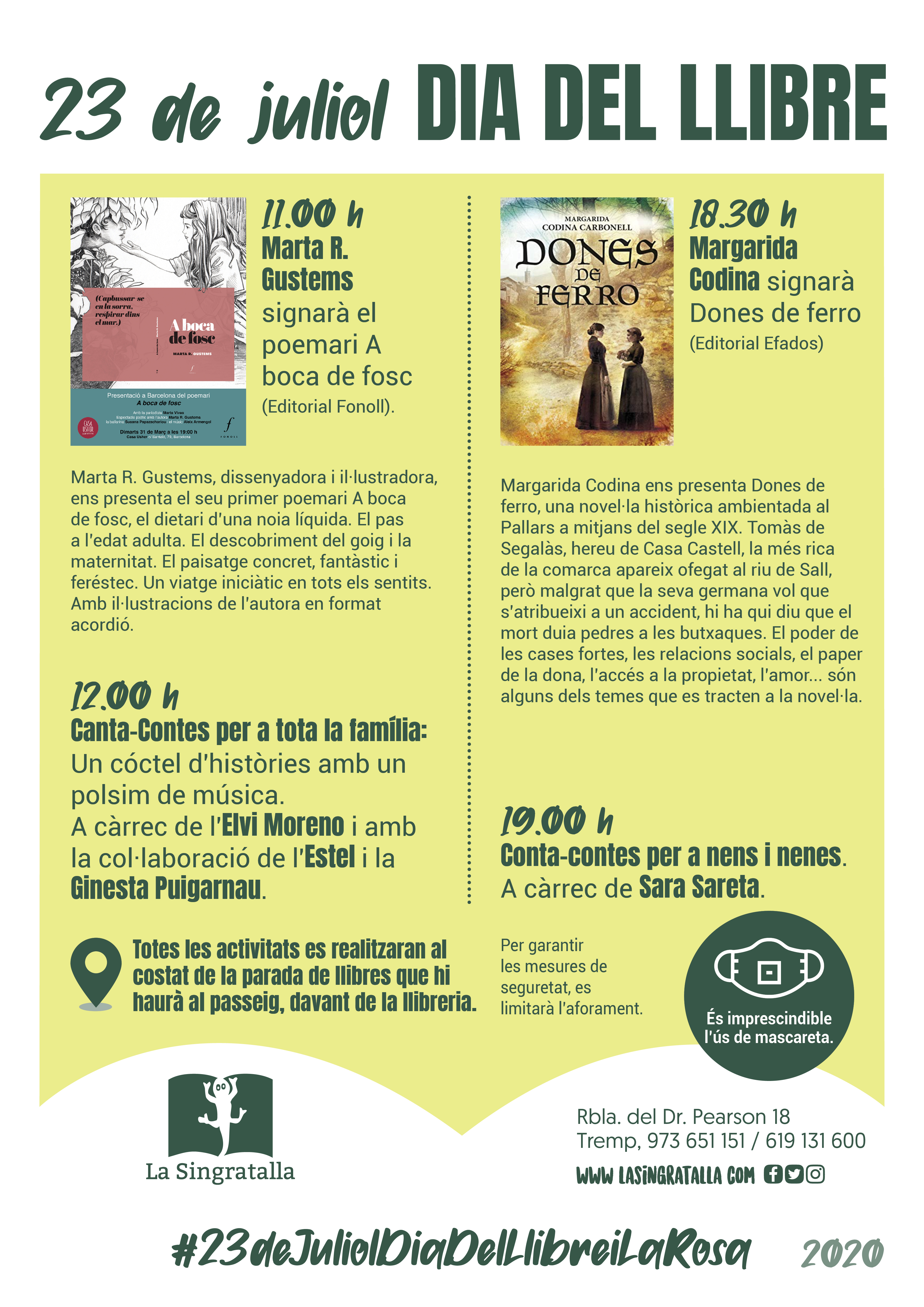 12:00 Canta-Contes per a tota la família, amb l'Elvi Moreno i amb la col·laboració de l'Estel i la Ginesta Puigarnau.