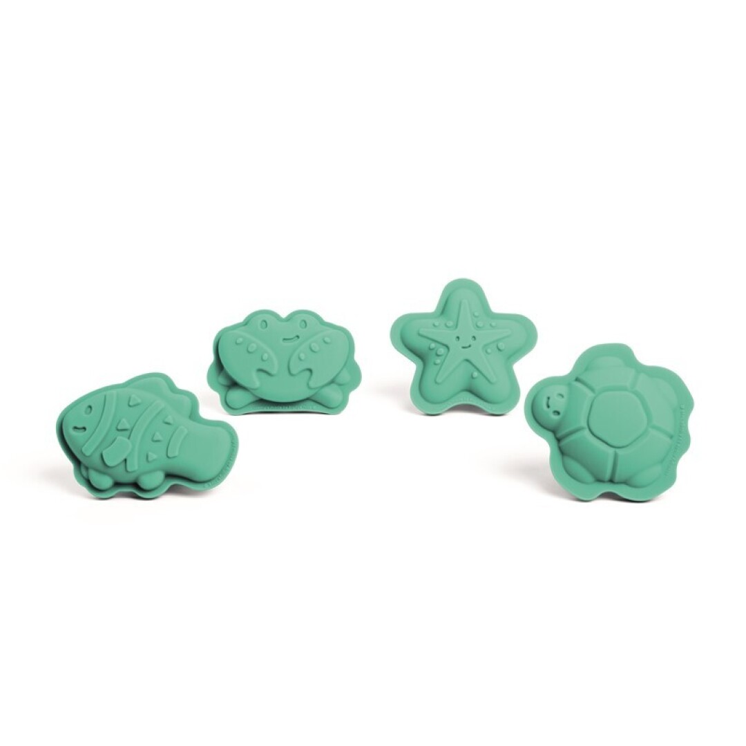 Diverteix-te a la platja amb aquest conjunt de 4 motlles de sorra fets 100% de silicona. Els infants poden crear formes úniques, decorar castells o fer murals marins amb figures com una estrella de mar, un cranc, un peix i una tortuga.