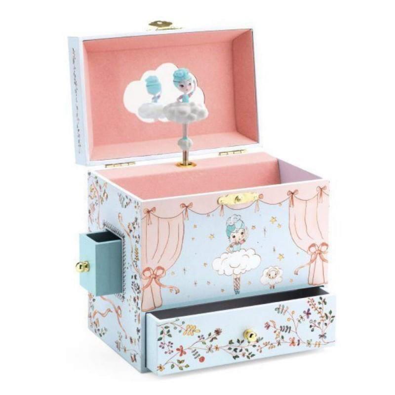 Ballerine en scène és una caixa de música bellament il·lustrada amb quatre calaixos per guardar-hi joies i secrets.