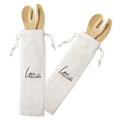 Pràctic set de 3 coberts, fabricats amb bambú. Inclou 1 forquilla, 1 cullera, 1 ganivet. Fàcilment transportables cadascun amb la seva funda de cotó i amb un cordó auto tancament. Idea per a parelles.