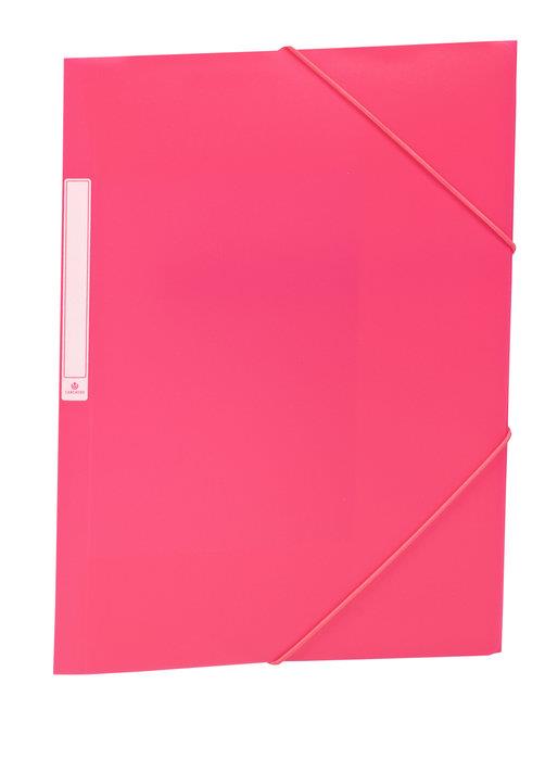 Carpeta de polipropilè de color rosa, mida A4, amb 3 solapes interiors i banda elàstica. Presenta etiqueta al dors.