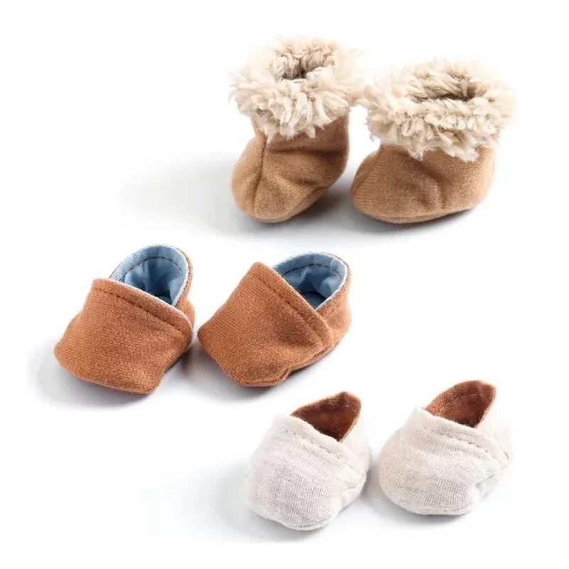 Els 3 parells de sabatilles Pomea complementen perfectament els vestits de nines, oferint al teu fill una selecció de diferents colors i materials.Còmodes i suaus per als peus de les nines.