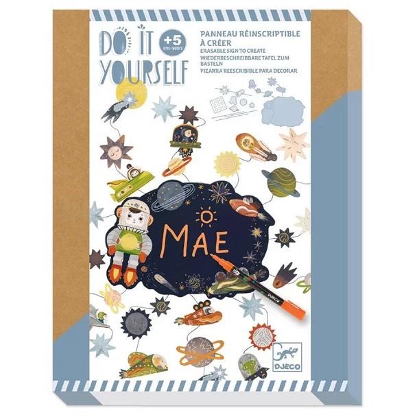 Un kit creatiu amb un panell força esborrable per crear sobre el tema de l'espai. El nen enganxa les il·lustracions a les varetes semirígides amb adhesius d'escuma gruixuda, després les munta a la pissarra, que es transforma en un bonic panell decoratiu reescrivible. Un producte original que transforma la part pràctica del panell esborrable en un objecte estètic.