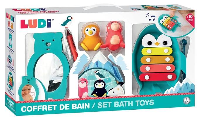 El conjunt inclou un xilòfon de bany, un mirall d'ós de peluix, 2 animals ruixadors i un llibre per pintar amb llapis.