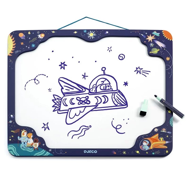 Aquest quadre, Pissarra Espai, és un objecte decoratiu per a l'habitació dels nens en el qual poden expressar-se i penjar records. A partir de 5 anys.