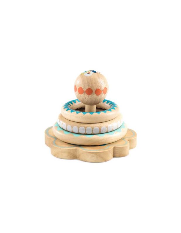 Un joc d'apilament de fusta natural amb 3 anelles de diferents mides. Anelles grans i fines, fàcils d'agafar, que el nen es divertirà posant a la vareta de la base de fusta. Un joc de manipulació perfecte per desenvolupar la motricitat fina en els nens petits.