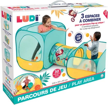 Un gran joc per divertir-se per a dos o tres! Un cub, un túnel de temàtica selva i una zona de joc de pilota: 3 espais per utilitzar sols o per combinar per formar un camp emergent únic. Juga com vulguis! La seva estructura flexible i resistent és lleugera i de bona mida. Dissenyat amb grans obertures de ventilació per facilitar l'accés, aquest bonic espai de joc garanteix una comoditat òptima per divertir-se amb els altres. Ben pensat, el camp està prou tancat i evita que les pilotes s'escapin! La zona de jocs ofereix als nens el seu propi espai per expressar-se amb llibertat. Estimula la imaginació dels nens i fomenta les habilitats motrius. Divertint-se milloren les seves habilitats, alliberen la seva energia i descobreixen compartir i la importància de l'esperit d'equip. La zona de joc està equipada amb el sistema pop-up, un concepte fàcil de muntar i plegar amb un caràcter nòmada. Es plega i es desplega fàcilment i s'emmagatzema en una bossa de transport inclosa. Lleuger i ocupa molt poc espai un cop plegat, segueix la família a tot arreu durant els seus viatges. Ha estat pensat per utilitzar-lo a l'exterior, al jardí,... o a l'interior, arrecerat els dies de pluja!