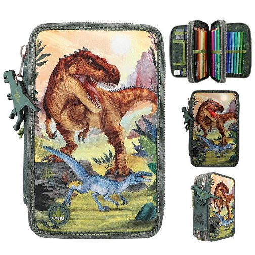 Dinosaures, llueixes LED i molta acció. En pitjar un botó s'il·luminen les boques, els ulls i el sol en aquesta preciosa imatge en tons verds que adorna la cara davantera d'aquest estoig de Dino World. També porta penjant un dinosaure verd de la cremallera. Els tres compartiments separats es venen plens de material: 18 llapis de colors, 18 retoladors, 2 llapis, goma d'esborrar, maquineta, regla, tisores, cola en barra i fins i tot disposa d'una petita butxaca amb tancament de velcro. Les piles són recambiables. Les llums LED s'encenen durant 15 segons aprox. en pressionar el botó corresponent. Material: PES 100 per 100.