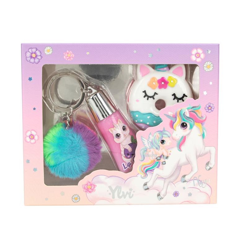 Moníssim set de lluentors labials de Ylvi perquè els llavis brillin el doble. El labial en la capseta d'unicorn té aroma a poma. El labial rosa en el tub té aroma a nabiu. Un extra molt fanfarró: Porta penjant de la caputxa del tub un clauer platejat amb un pompó de color.