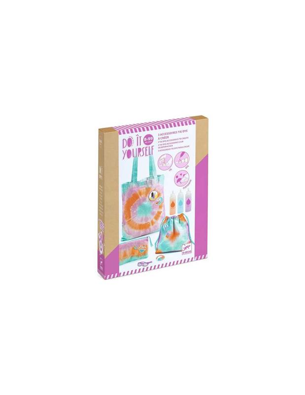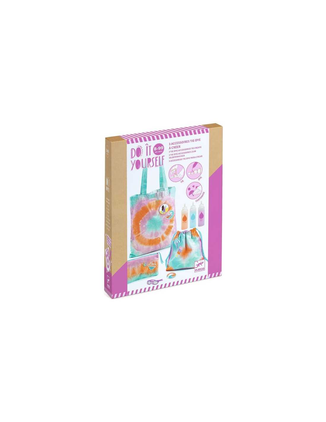 Aquest kit permet als nens aprendre a lligar (tie) i pintar (dye) accessoris de tela amb l'ajuda dels colorants inclosos, seguint tres tècniques de creació de patrons: circulars, geomètrics i en línies. El cofre consta de 3 accessoris de cotó natural (sac circular, pochon geomètric i forat en línia assortida), preparats per ser personalitzats amb colorants segurs per als nens. Un cop els accessoris tenyits i secs, es poden embellir amb 9 escuts termoadhesius subministrats, afegint un toc personal i tendència.