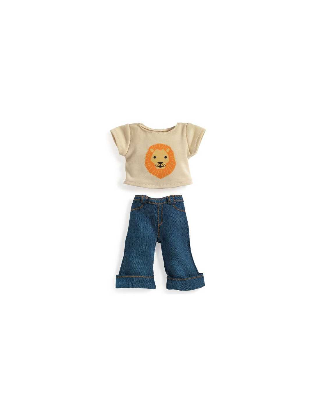 Aquest conjunt es compon d'un pantaló de tela de jean amb amples reversos, aportant un toc d'estil relaxat i modern. Està acompanyat d'una samarreta de mànigues curtes en jersey color ivori, adornat amb un magnífic imprès de lleó.