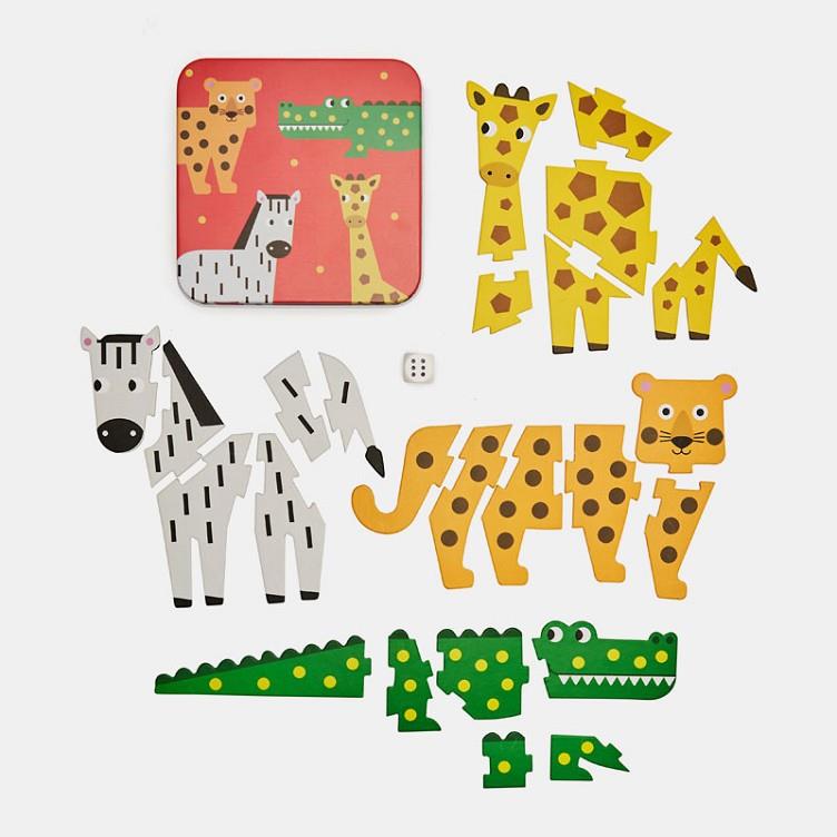 Joc instructiu, de girafes cocodril, zebres. Tira els daus per torns, fes coincidir el nombre de punts i construeix el teu animal! El primer a construir l'animal guanya.