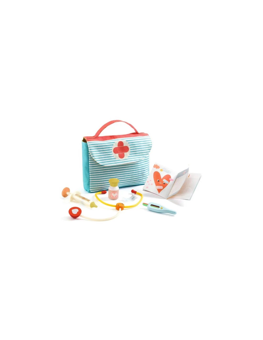 Una maleta de metge que conté tots els accessoris per jugar a metges i curar les nines: 1 termòmetre, 1 fonendoscopi, 1 xeringa, 1 ampolla de medicaments, 1 tirita i 1 quadern de salut.