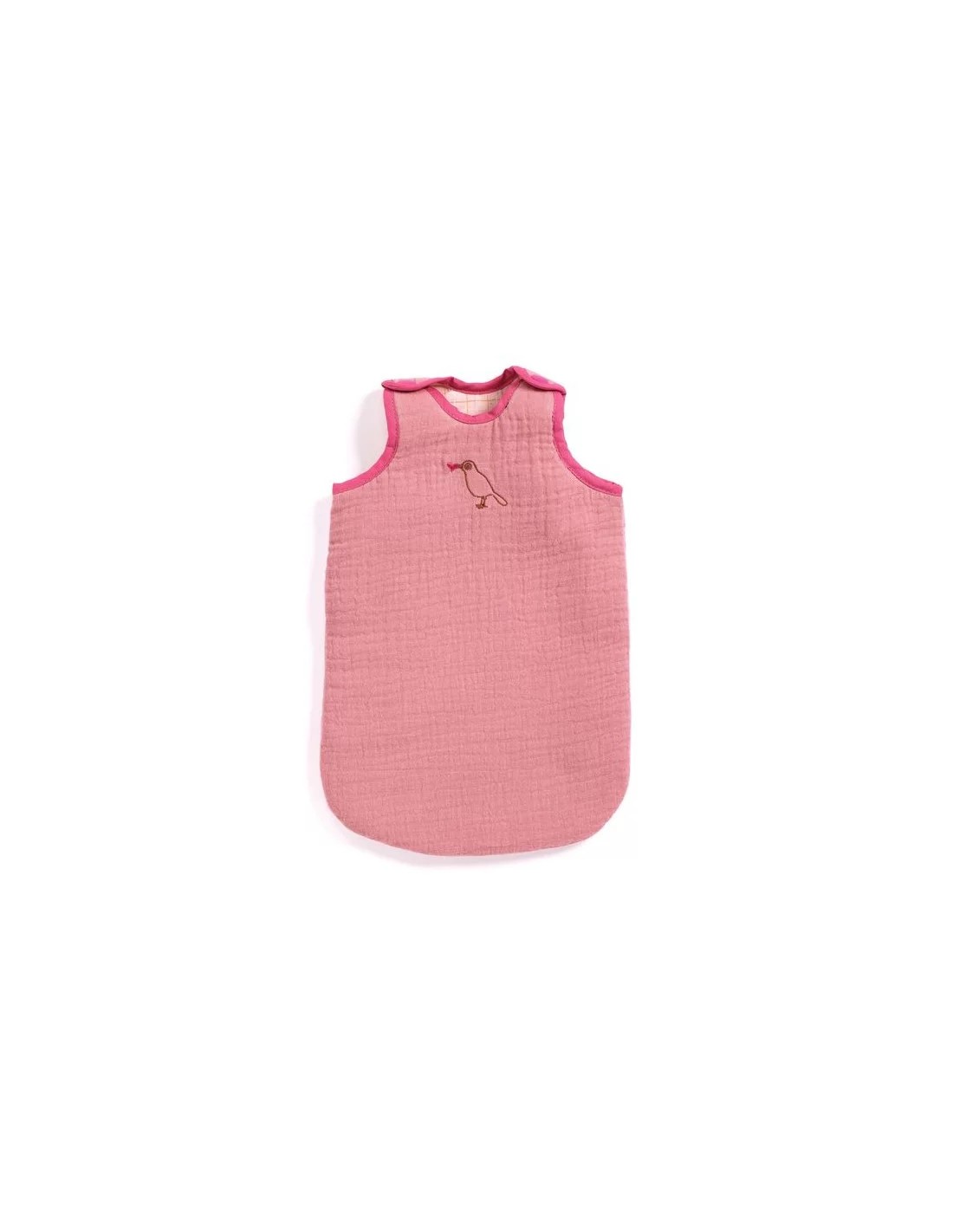 Un bonic sac de dormir rosa amb un ocell brodat perquè el nadó passi una bona nit i no es desperti. Un sac de dormir de qualitat i tendència, de cotó onat imprès a l'interior i doble gasa brodada a l'exterior, adaptat per a nines de 30 a 36 cm.
