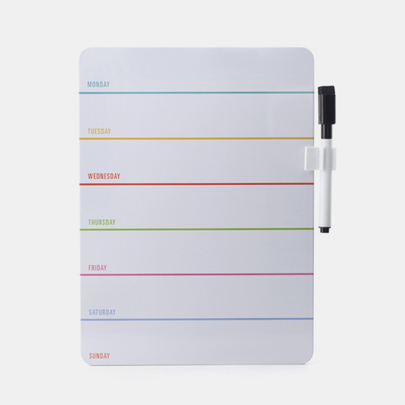 Pissarra magnètica amb els dies de la setmana.Apunta sopars, encàrrecs, tasques, etc. Així segur que no t'oblides de res.Inclou retolador i imants per a col·locar en la nevera.Referència: MH70Material: Acer, imantMesures producte: 24 x 19 x 1 cm