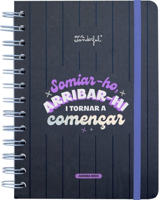 Agenda 2025 Mr. Wonderful Somiar-ho, arribar-hi... i tornar a amb organització setmanal, va de gener a desembre de 2025. Aquesta agenda conté: 160 pàgines de paper de 100 g amb la certificació FSC - Butxaca interior de cartó - Regle de plàstic interior - Frases diàries motivacionals - 8 fulls d''adhesius - Jocs i extres - Horaris i calendaris de 2025 i 2026.