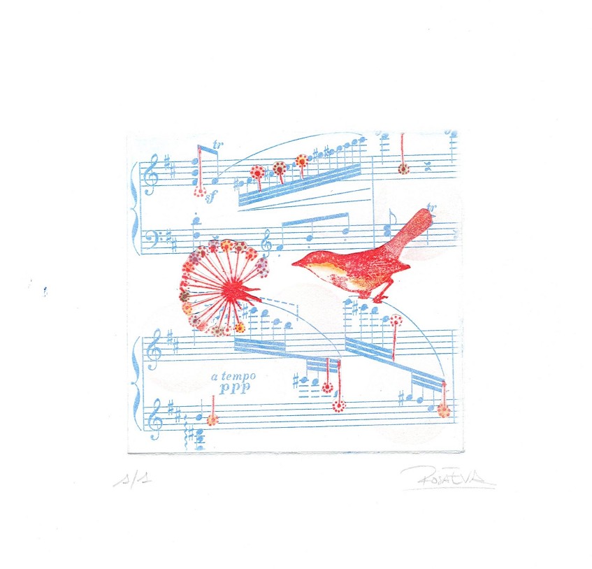 Impressió sobre paper cotó amb tintes a l'aigua. El procés manual de cada còpia fa que cadascuna sigui única i no hi hagi dues iguals. Còpia: 1/1 (única). Mides: 18 cm x 18 cm.