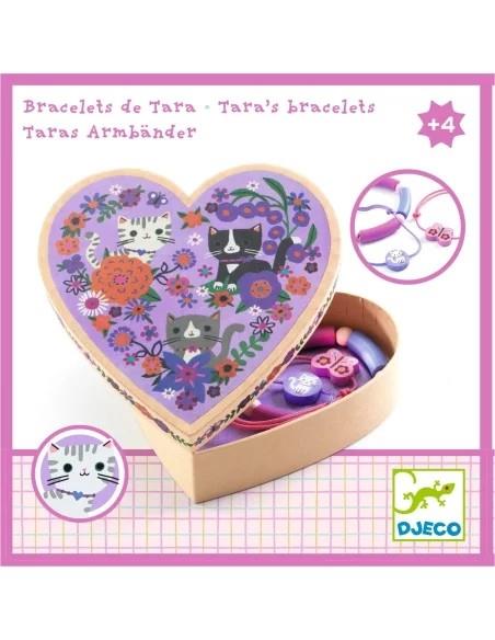 Les Pulseres en capsa decorativa Tara de Djeco són un adorable joc de tres polseres amagades dins d’una capsa en forma de cor amb una imatge de gats. Dues de les polseres ajustables estan fetes amb cordó i la tercera està decorada amb comptes de fusta. Una idea de regal perfecta per a una petita amant de les joies i els animals.