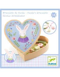 Les Pulseres en capsa decorativa Cécile de Djeco són un adorable joc de tres polseres amagades dins d’una capsa en forma de cor amb una imatge de gats. Dues de les polseres ajustables estan fetes amb cordó i la tercera està decorada amb comptes de fusta. Una idea de regal perfecta per a una petita amant de les joies i els animals.
